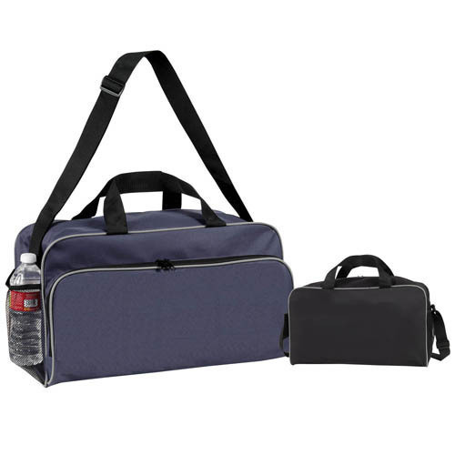 Classic duffel with en extra large imprint area, large zipper front pocket, double zipper pulls, side mesh pocket, side velcro closure compartment, and adjustable shoulder strap.