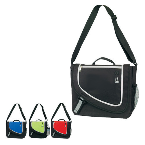 Front zipper pocket, double pen pockets and open picket under flap, velcro strap gusset closure, iPod port, side mesh pocket, carry handle, adjustable shoulder strap