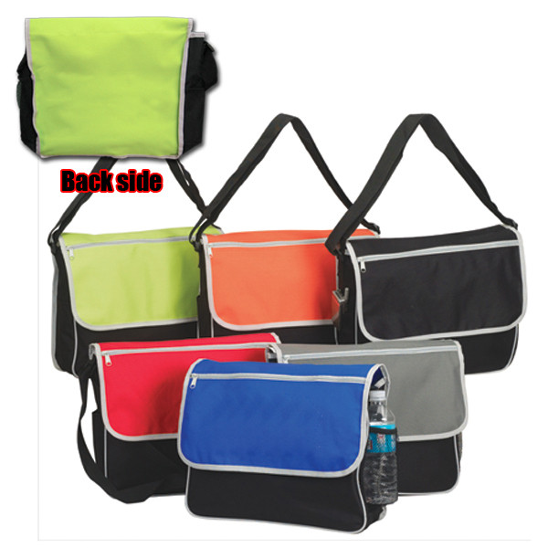 Zipper pocket on front, open pocket, mesh pocket, adjustable should strap, velcro closure.