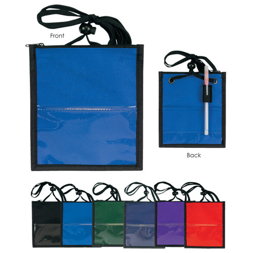 Zipper tote opening, large main pocket, clear PVC front pocket for badge, rear open pocket and pen holder, adjustable strap, vinyl strip for trade show ribbons